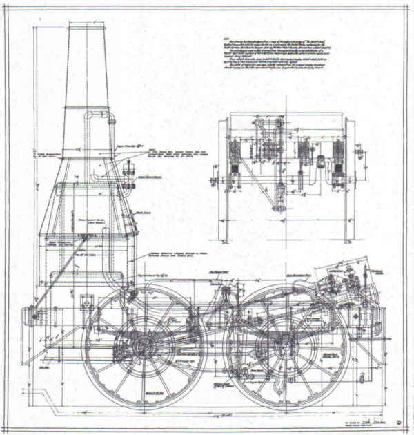 Developed from a copy of the original drawing of the Best Friend used by The West Point Foundry Association in 1830 to build the train. Several changes to the original engine are shown on this drawing: iron wheels were substituted for the original wooden wheels, engine width is slightly reduced to standard width and a tubular type boiler substituted for the porcupine type boiler. |