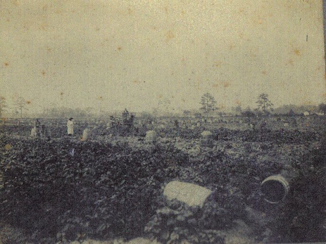 The worker gathered Irish potatoes in barrels. The potatoes were put through a grading machine (shown in background), then bagged and put in the rail cars for shipment to NY either by rail or on Clyde Mallory Line Steamships. The photos below are of the potato fields. Click on the photo to enlarge. (Courtesy B. Kennerty) |